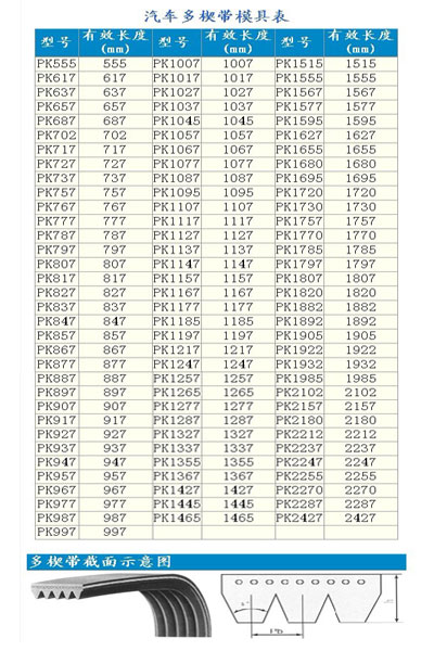 橡膠多楔帶兼 有v帶和平帶二者的優(yōu)點,既有平帶的柔軟、強韌的特點,又有v帶緊湊、高效等優(yōu)點。它的主要特點如下:1.傳動功率大,空間相同時比普通V帶的傳動功率的高30%。 2.傳動系統(tǒng)結(jié)構(gòu)緊湊,在相同的傳動功率情況下,傳遞裝置所占空間比普通V帶小25%。 3.帶體薄,富有柔軟性,適應(yīng)帶輪直徑小的傳動,也適應(yīng)高速傳動,帶速可達(dá)40m/s;振動小,發(fā)熱少,運轉(zhuǎn)平穩(wěn)。 ![]() 我公司主產(chǎn)的汽車多楔帶按照使用材料主要分為氯丁橡膠多楔帶和三元乙丙橡膠多楔帶。 |